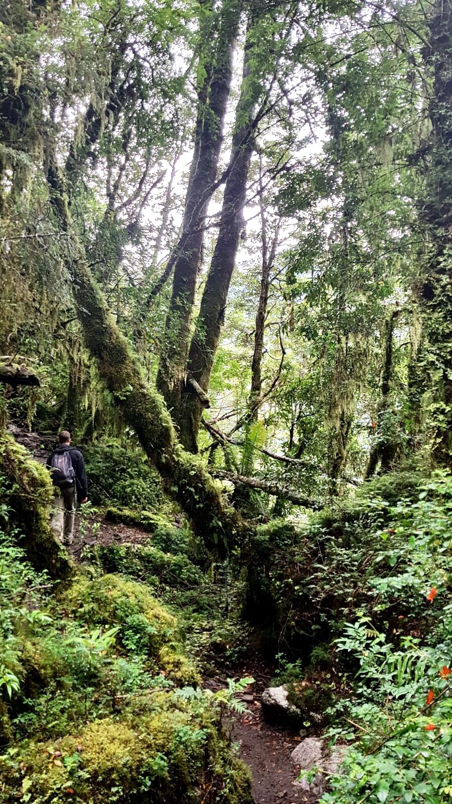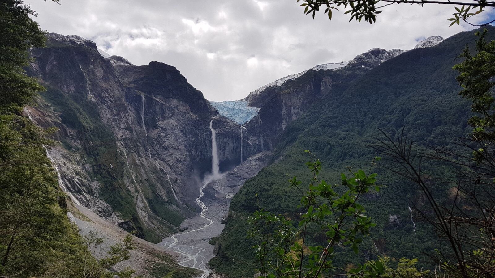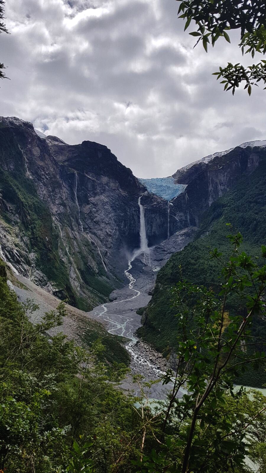 Nous profitons d’une journée dégagée pour aller visiter le Parc National Quelat. Une marche absolument magnifique nous attend dans une forêt/jungle encore humide. Apres 1h de randonnée boueuse nous apercevons enfin le glacier suspendu. C’était assez incroyable et nous avons pu entendre ses sourds craquements!!