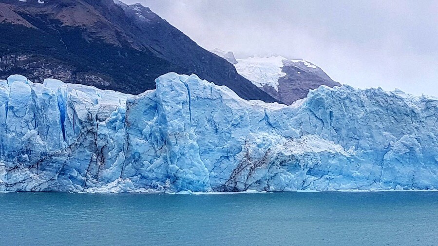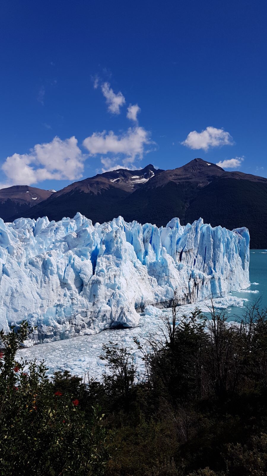 => Son front glaciaire c’est à dire sa limite (que tu verras sur les photos) est de 5 000 mètres de longueur. Avec une surface totale de 250 km2 et une longueur de 30 kilomètres, il est l’un des trois seuls glaciers de Patagonie qui n’est pas en recul puisqu’il avance d’environ deux mètres par jour (700 mètres par an). Sa hauteur est de 170 mètres dont 74 mètres sont émergés, le reste se trouvant sous les eaux du lac Argentino.